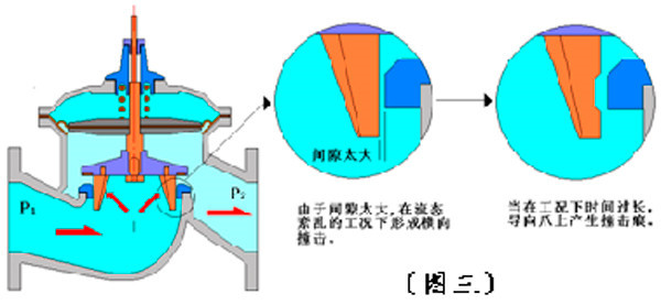 從減壓閥的過(guò)流方式分析:水流沿節(jié)流錐流向出口,有效地減少了紊流現(xiàn)象,有利于P2的穩(wěn)定性和低噪聲。如圖六所示。