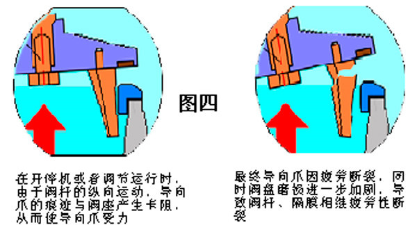 4.2.3終,因機(jī)組開(kāi)停機(jī)或流量變化時(shí),導(dǎo)向爪上形成痕跡卡在閥座上,在縱向受力的工況下,導(dǎo)致導(dǎo)向爪、閥桿的彎曲或斷裂。如圖四所示。#5、#4機(jī)減壓閥解體檢查看,閥座不銹鋼圈螺栓存在松動(dòng)、脫落隱患,隔膜碟鎖固螺栓也無(wú)安全鎖定措施等,致使減壓閥在使用過(guò)程中存在一定的安全風(fēng)險(xiǎn)。